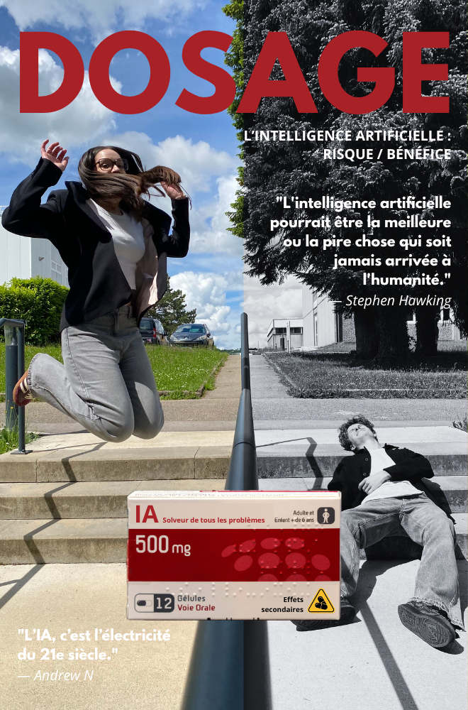Notre magazine s’intitule « DOSAGE », un titre qui renvoie à l’idée d’équilibre dans l’utilisation de l’IA. La photographie met en scène cette dualité à travers deux ambiances distinctes.