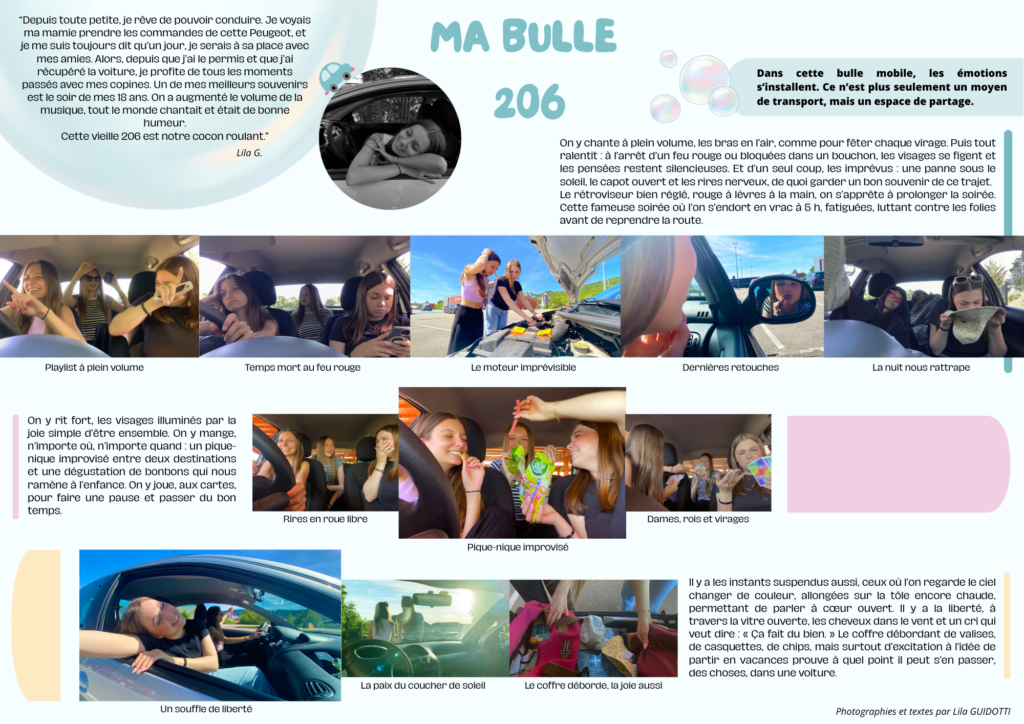 Pour ce projet, j’ai choisi de m’intéresser à la voiture comme espace de vie et de partage, à travers le thème « Ma bulle 206 ». La voiture n’y est pas seulement présentée comme un moyen de transport, mais comme un lieu d’émotions, de souvenirs et de moments partagés entre amis.